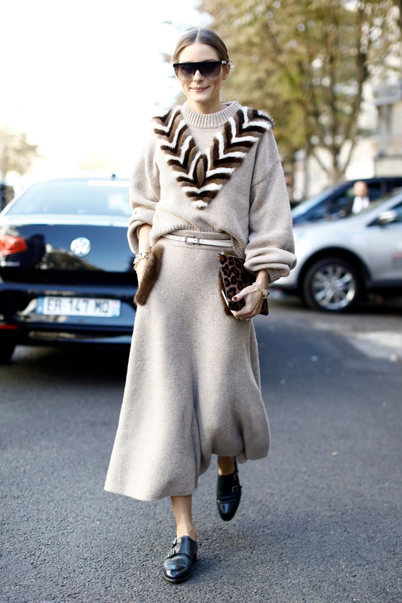 Olivia Palermo diện set áo váy bằng len màu nude kết hợp cùng chi tiết lông thú của Izaak Azanei và Santoni.
