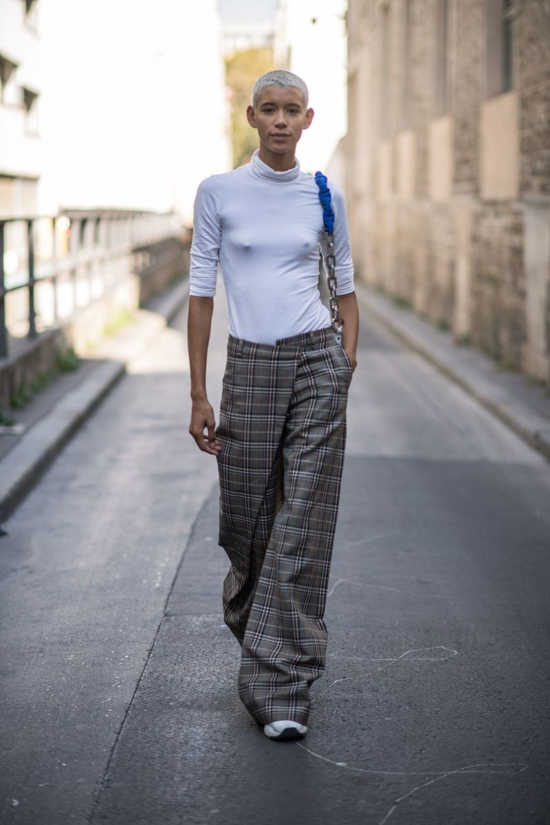 Người mẫu Dilone thay chiếc skinny jeans của mình bằng quần dài ống rộng họa tiết sọc caro sành điệu và năng động hiệu Monse.