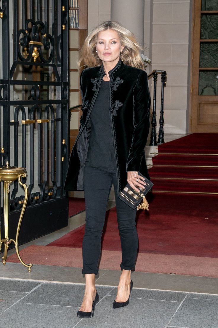Kate Moss mặc một chiếc áo khoác Nehru cổ cao đen bằng nhung in hoạ tiết đầy sang trọng của Saint Laurent.