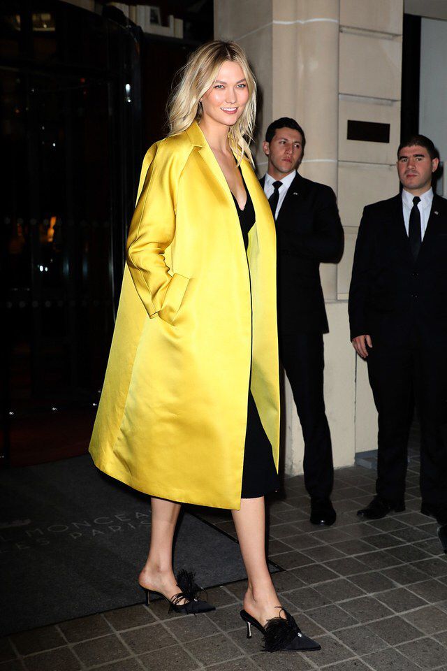 Karlie Kloss gợi lên sự thanh lịch của thế giới hoài cổ khi khoác bên ngoài bộ váy đen một chiếc áo khoác satin mang gam vàng rực rỡ của mùa hoa hoa cúc đang đến của các nhãn hiệu Martin Grant and Manolo Blahnik.